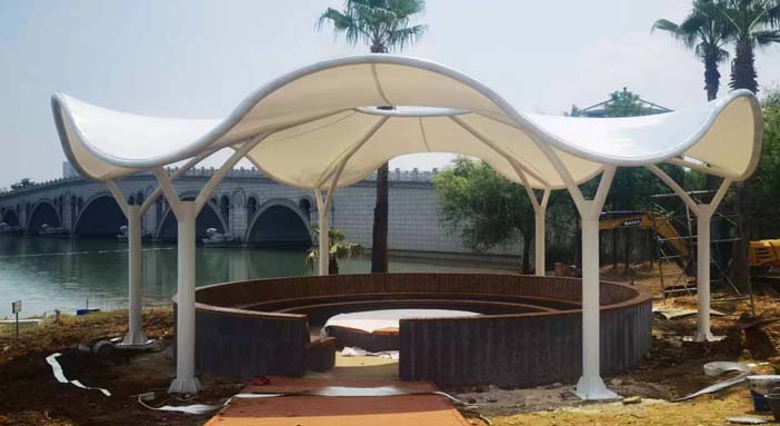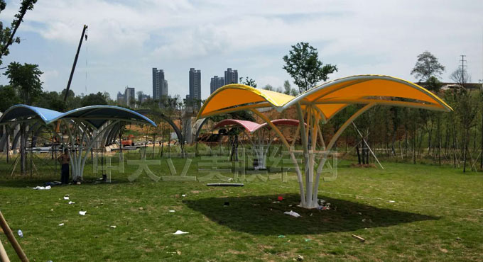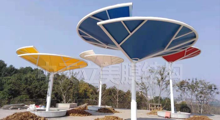 此次张拉膜项目我司设计师结合乐乡公园主题环境设计了这款极具设计感的叶子造型,高低不异,错落有致钢结构骨架搭配五个颜色各异的彩色膜材,造型逼真同时又不失设计感 ,游客一到乐乡公园就能远远看到,为乐乡公园大门增添一份亮丽的风景线。