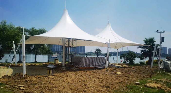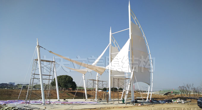 孝昌凤凰天仙城与湖北中天立美膜结构公司签定一帆风顺景观膜结构项目,该项目为一帆风顺景观膜定制,我们的膜结构设计师结合现场环境给客户设计出了"一帆风顺"造型,甲方确认非常满意,该景观膜结构整体长22米,高22米,宽7米,相同景观膜结构造型共2组.