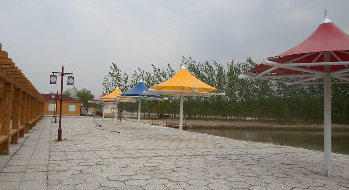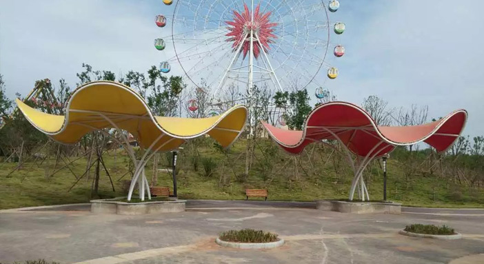 该项目结构以荷叶的外形为基本参照设计,全弧管结构拼装,做工精细,整体流线型的外形和建筑膜材全硬边式张拉给人以刚柔之美,为了丰富其视角效果,我们采用了彩色建筑膜以示渲染,作为公园的休闲景观,既给人以纳凉之处,又给整体环境以时尚现代之美。此类结构被广泛应用于公园、江河湖畔、广场、景区等。