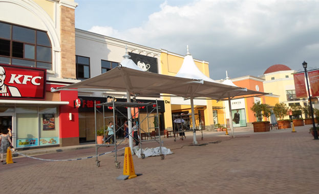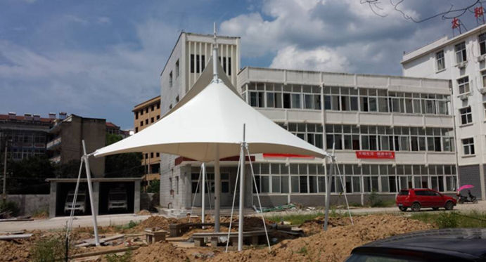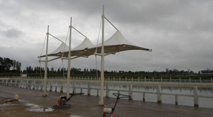 该项目为永久式景观遮阳伞,其结构为内撑式冒顶膜结构,单帽单立柱支撑,该项目每个都是连帽中高侧低的连体形式,pvdf建筑膜材裁剪为连帽整张设计张拉,对施工工艺、精度要求高,这种结构是很多景观遮阳项目的选择,其尺寸不受限制,可大可小,可单冒顶,也可无限连帽,为了结构的完美,冒顶装饰可根据现场环境和结构...