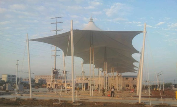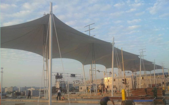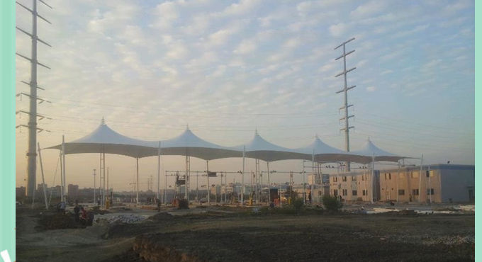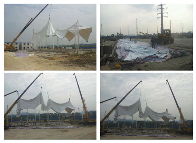 图1 河南高速公路膜结构收费站大棚现场施工图