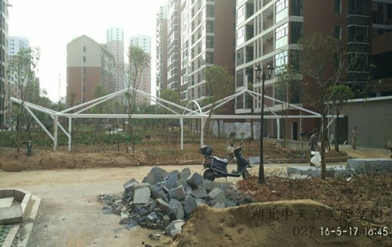 以上是对“鄂州荣府小区停车库出入口膜结构施工中”的一个展示。在这里中天立美膜结构公司小编提醒您,如果您对出入口膜结构案例还有疑问或者有兴趣的话,请点击联系我们在线客服,或致电:027-82731193,湖北中天立美膜结构——专业膜结构工程定制商。
