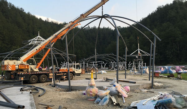 十堰樱桃小镇亲子游乐园膜结构选择与湖北中天立美公司合作游乐园顶棚膜结构项目!本次合作游乐园顶棚膜结构项目合作面积达1250平方,一共要做六个造型各异的膜结构顶棚。下面中天立美小编就去十堰亲子游乐园现场去看看工程进度,为工程人员施工现场情况做个简单的现场介绍。